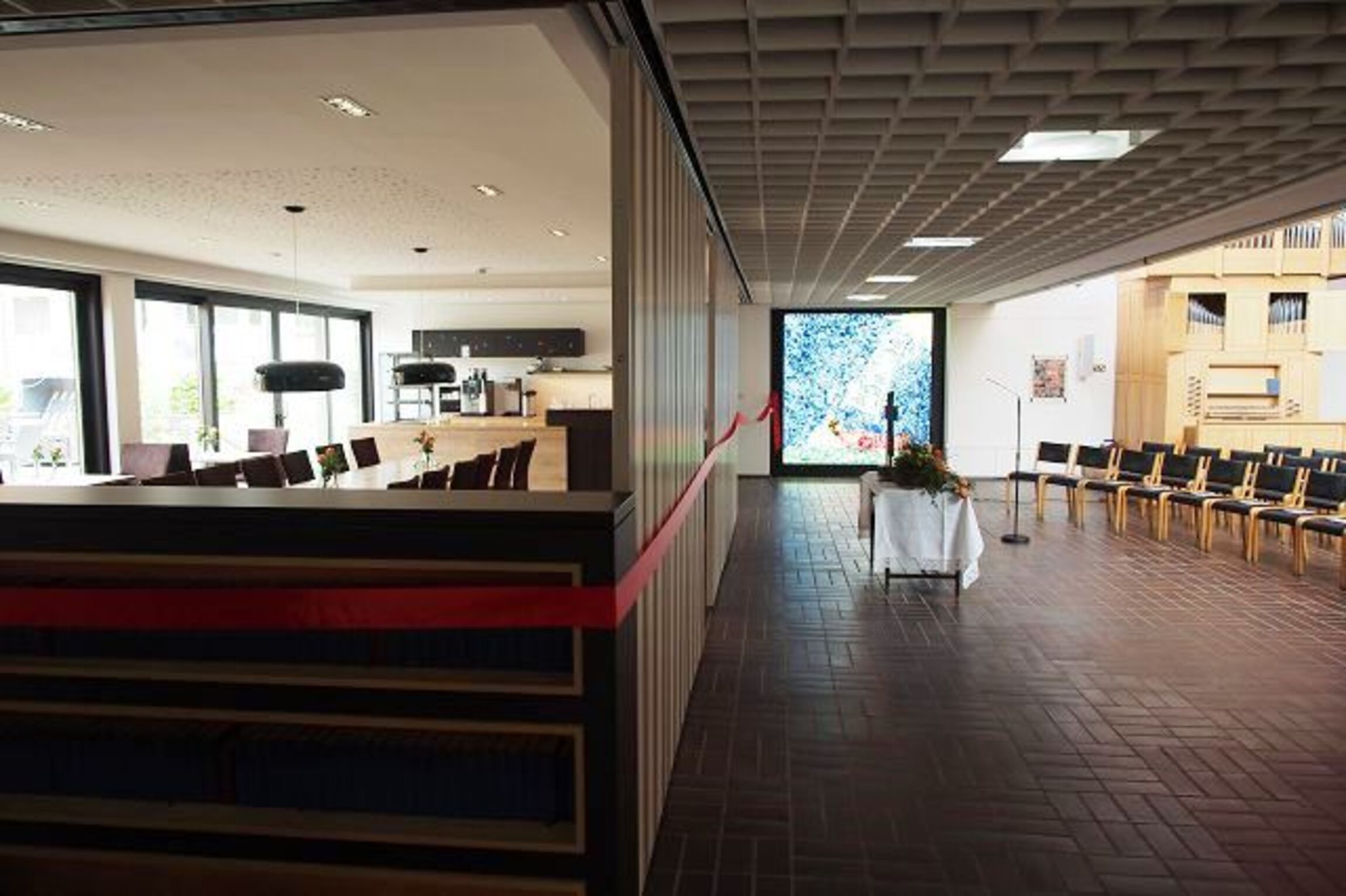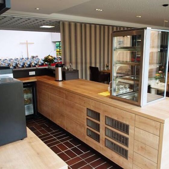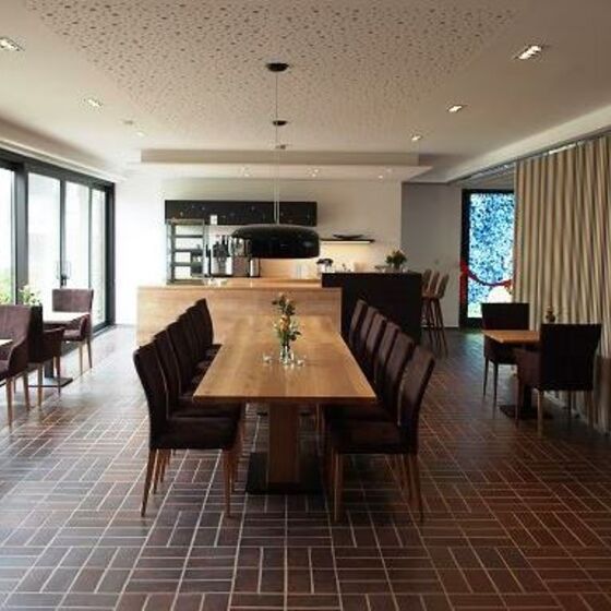 Die sichtbare Nähe zum Kirchraum wird unaufdringlich in die Gestaltung des Gastraumes einbezogen und schenkt ihm eine besondere Atmosphäre.